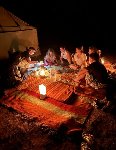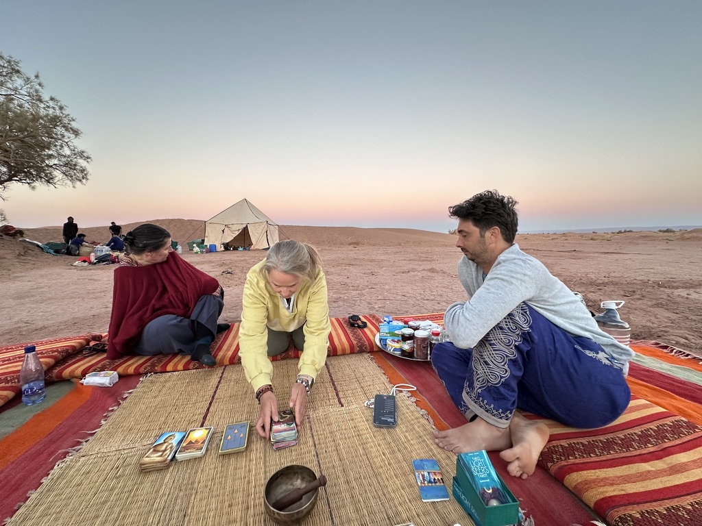 Ghizlane (les portes du désert) pour vivre une aventure en nomades accompagnés de 5 dromadaires, de 2 chameliers, d’un cuisinier et de notre guide. C’était au delà de tout ce que j’avais espéré. Dormir à la belle étoile sous une voûte céleste pleine d’étoiles à 360 degrés, des plats marocains merveilleux autour du feu de camp et des marches dans le sable tous les jours dans un décor époustouflant. Des ateliers bols chantants ou baguettes, des groupes de paroles matin et soir, des tirages de cartes, des méditations guidés par Gwenola ont été forts en énergie, en émotions.